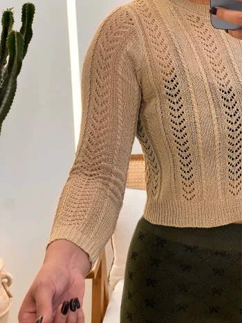 ترفند لایهبندی: چون بافتِ بلوز اجازه میده کمی هوا رد بشه، برای فصلهای خنکتر زیرش میتونی بلوز نازک یا تیشرت یقهگرد بپوشی؛ اینجوری هم گرمتر میشی، هم بافتِ رویی خودش بیشتر دیده میشه.